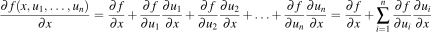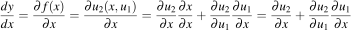 We reference the law of total derivative, which is an important concept that just means derivatives with respect to x must take into consideration the derivative with respect x of all variables that are a function of x.