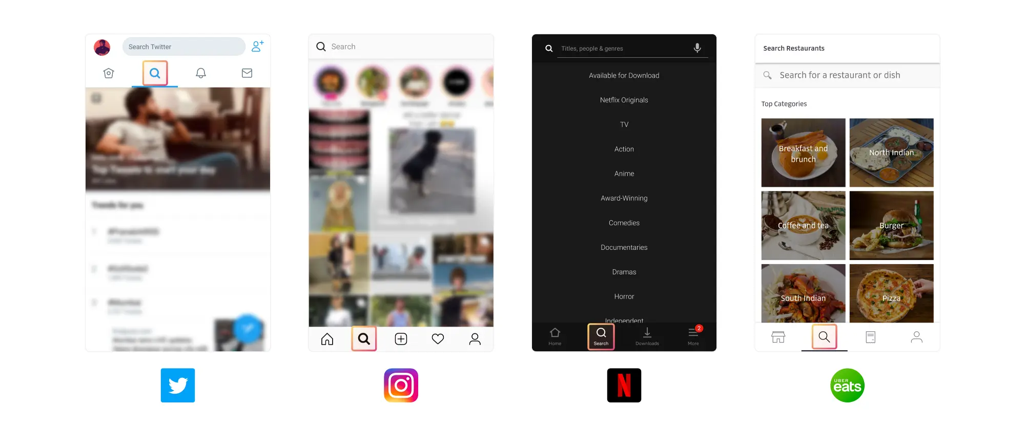 用户不确定他们在寻找什么时,app可以指导用户发现他们想要的内容。例如:Netflix and Uber Eats,这两个app允许用户通过流派和菜系去探索app,这适用于这样的用户,他们知道自己想看一档喜剧节目,但不确定应该看哪一个。