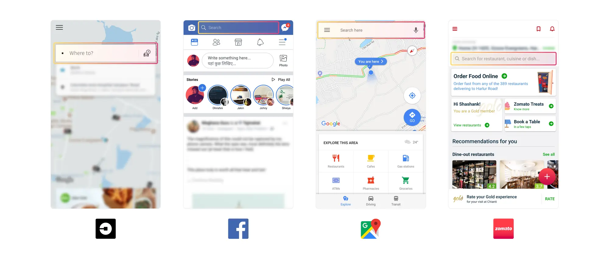 用户打开app的主要目的是搜索一些东西。例如:Google地图、优步或者 Zomato。大多数时间用户打开这些app都希望搜索一个地点、餐厅或者菜肴。