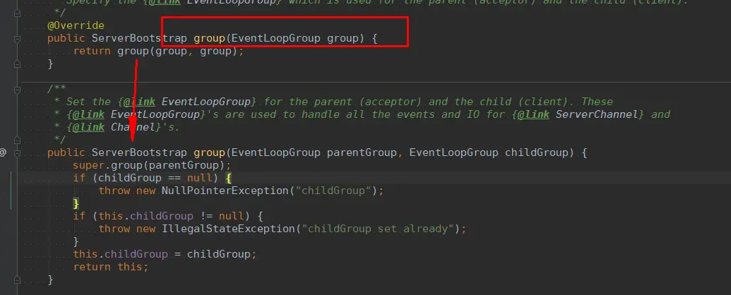 - 创建ServerBootstrap对象以及 NioEventLoopGroup 对象 。然后进行优雅的链式调用,这里看一下group(worker)这个方法的源码