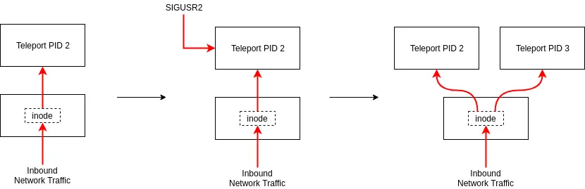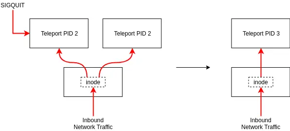开始一个新的Teleport进程时会创建一个socket listener,其会接收发送给目的端口的所有traffic。我们增加一个信号处理函数来处理 SIGUSR2,这个信号可以使Teleport复制一份lisenter socket然后传递的文件描述符和其环境变量的元数据信息生成一个新的进程。一旦一个新的进程开始,就使用前面传递过来的文件描述符合元素开始改造socket并开始处traffic。