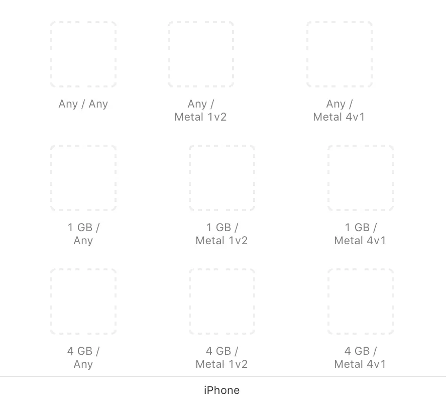 如果我们选择了 1GB 、4GB;Metal 1v2、Metal 4v1。如果设备只选择了 iPhone 就会出现这样的 3 * 3 个格子,里面可以放入对应的资源(plist 也可以)。