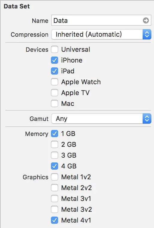 接着在属性栏就可以配置对应不同设备的资源分类,除了常规的产品线区分,还可以按照设备内存大小和Metal 版本。如果有的资源只在高性能的设备上使用,按照内存、Metal 版本区分是一个好主意。
