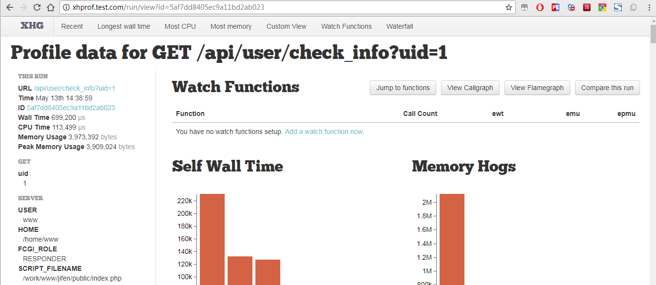 我们请求几次应用的接口,打开浏览器输入http://xhprof.test.com/,可以看到: