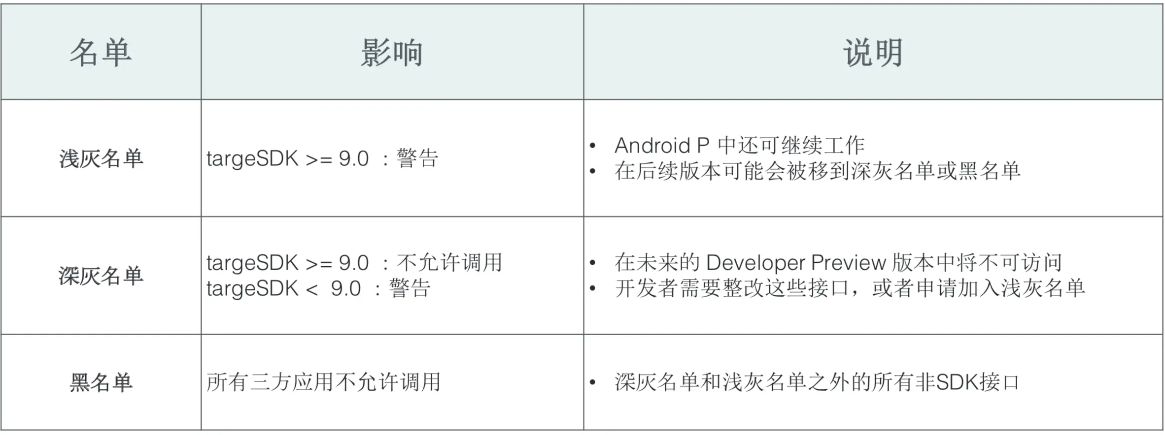 首先,作者介绍了Android P的时间表,今天3月谷歌发布了Android P的预览版,预计今年Q3会发布最终的release版本;Android P中发布了禁令:禁止调用非SDK的接口,各种访问非SDK接口的方式都会产生错误或者其他不希望的后果,如果下表中详细说明了各种访问方式及相应的结果。