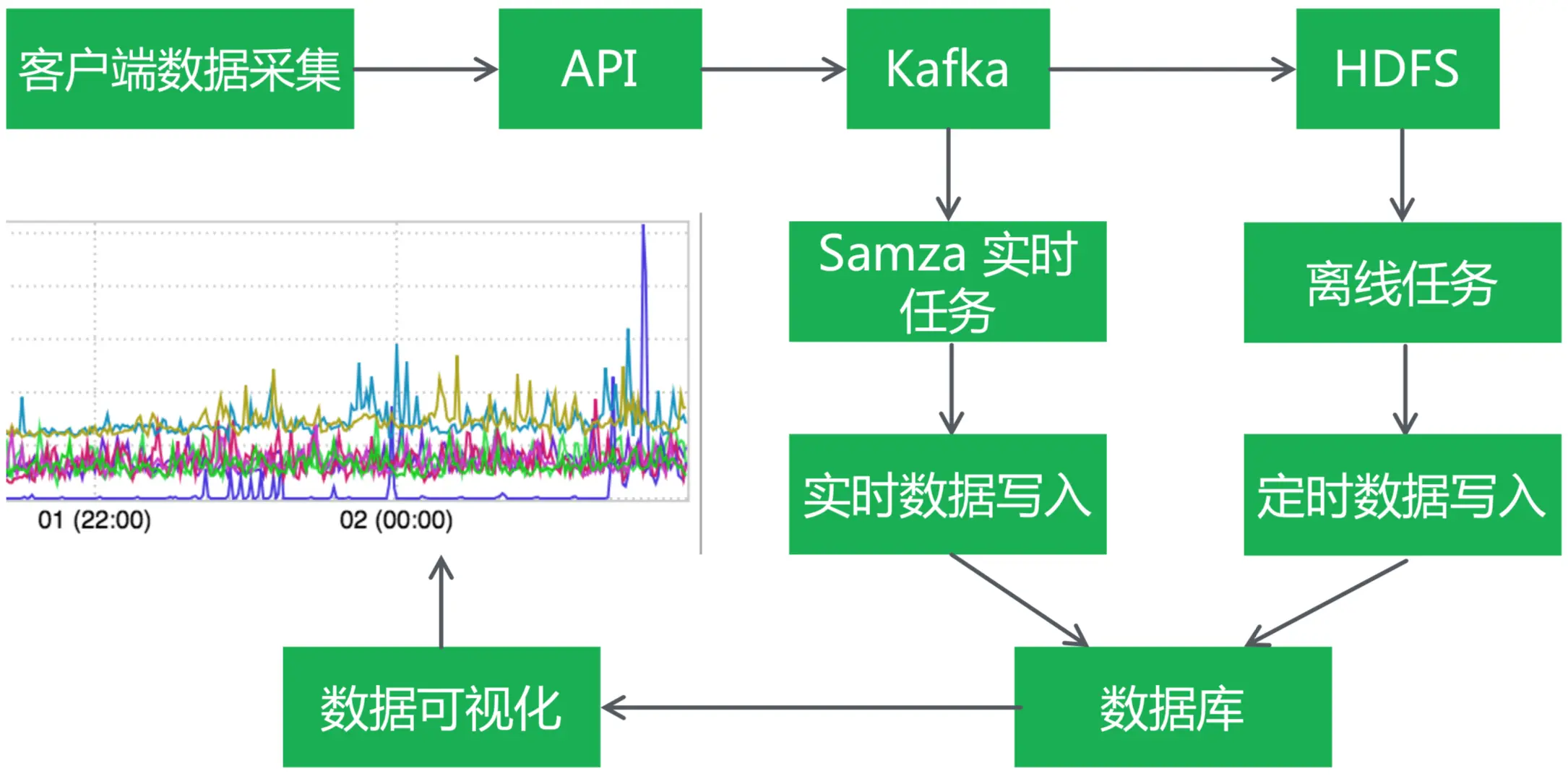再次,作者展示了领英从数据采集、存储、上报到数据可视化的整个方案。如下图所示:首先是客户端进行数据采集,经过后台提供的数据上传Api接口把数据上传到后台,后台服务把数据写入到Kafka,接着把数据分发到下游的订阅者:Samza实时任务和HDFS,Samza实时任务主要是流式处理,具有较高的实时性;HDFS是每天或者每个小时的一个定时任务处理,主要是对离线数据进行批量操作,处理大量的数据,但是实时性就差一些了;当处理完成之后,会把实时数据和定时数据写到数据库里,通过数据可视化工具,就能看到不同数据对应的表格;最后通过设置数据的性能报警阈值,可以对性能问题进行实时监控。