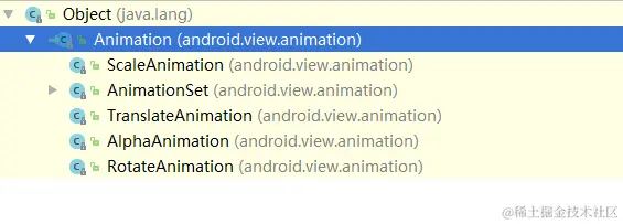 View动画的四种变换效果对应着Animation的四个子类,分别是:TranslateAnimation,RotateAnimation,ScaleAnimation,AlphaAnimation。这四种动画既可以通过XML来定义,也可以通过代码来动态创建。他们的集成关系如下: