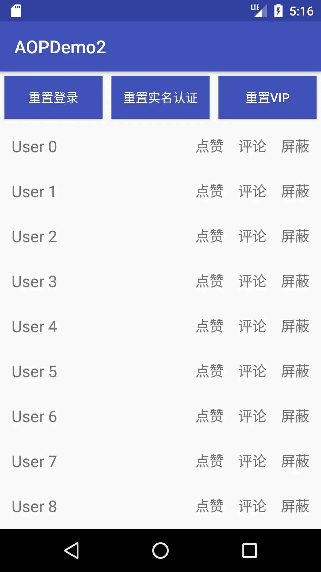 页面是上面这样,我们的app有登录模块(loginmodule)、实名认证模块(authmodule)、vip模块(vipmodule),“点赞”要求用户登录,并在登录成功后自动点赞;“评论”操作首先要求用户是登录状态,其次还要是进行了实名认证状态;“屏蔽”要求用户vip等级达到3,如果不到3会跳转到购买vip页面,在购买的时候再验证登录状态,同样,购买成功后自动执行屏蔽操作。