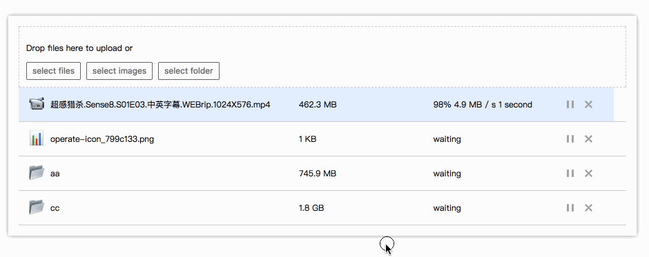运行效果就像最开始的那张图,可以同时上传多个文件,上传暂停之后更换浏览器,选择同一个文件可以实现继续上传的效果,大家可以自行进行尝试,代码会在我的GitHub上进行更新。