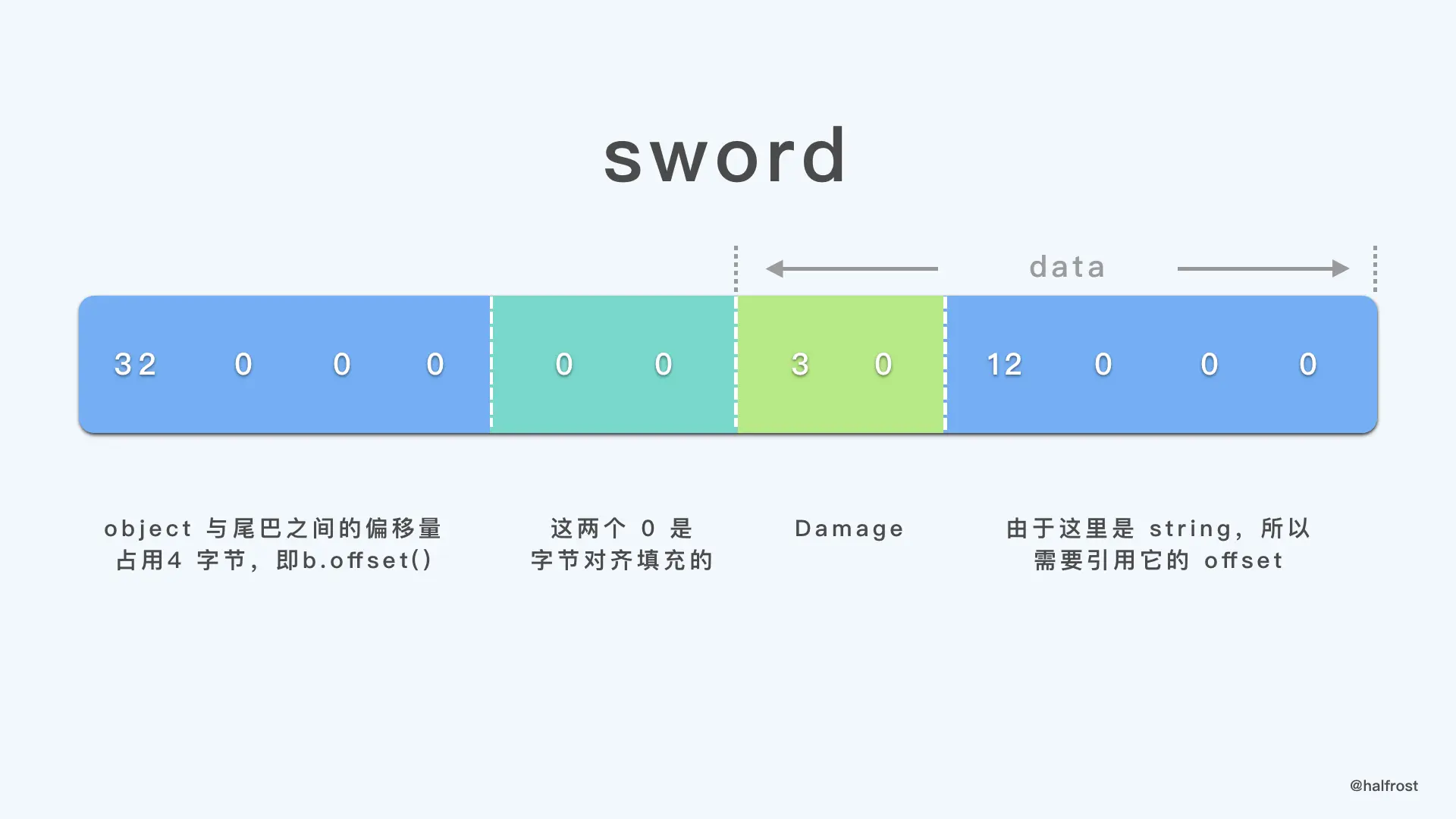 Weapon 有 2 个字段,一个是 name,一个是 damage。name 是 string,需要在 table 创建之前创建,并且在 table 中只能引用它的 offset。我们这里先创建好了 “sword” 的 string,offset 为 12,所以在 sword 对象中,需要引用 12 这个 offset,当前 offset 为 24,减去 12,等于 12,所以这里填上 12,表示的意义是往前偏移 12 存储的数据才是这里的 name。damage 是一个 short,直接内嵌在 sword 对象中即可。加上 4 字节对齐的 2 个 0,开头还要再加上 4 字节的当前 offset 偏移量。注意,这个时候的偏移量是针对 buffer 尾来说的,还不是针对 vtable 而言的偏移量。当前 b.offset() 为 32,所以填充 4 字节的 32 。