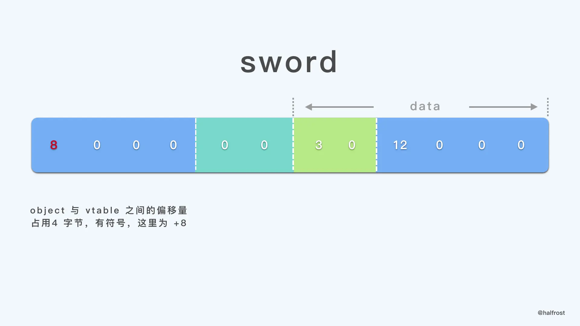 最后一步需要修正 sword 对象头部的 offset,修改成距离 vtable 的 offset。由于当前 vtable 在低地址,所以 sword 对象在它的右边,offset 为正数,offset = vtable size = 8 字节。对应代码实现见第 10 步。