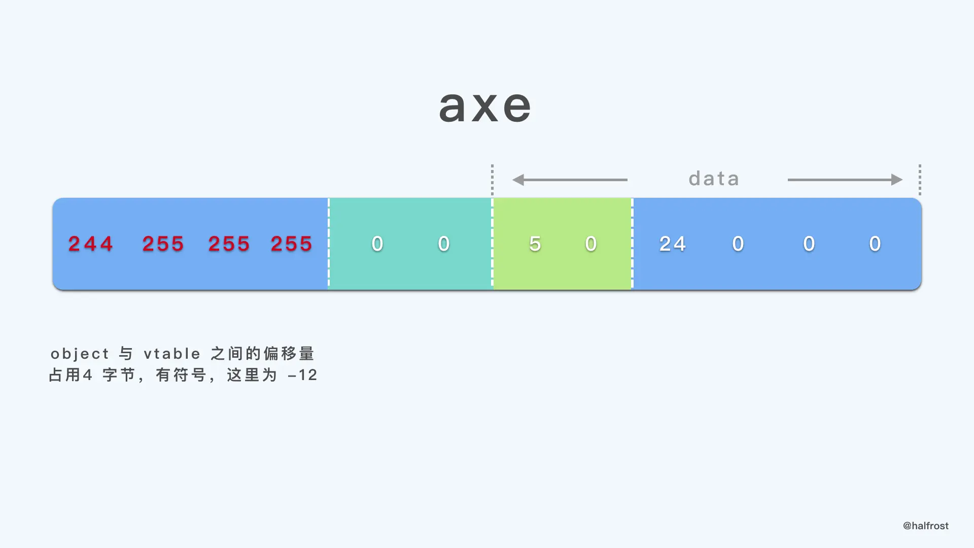 这里可以用 axe 对象的例子来说明找到相同 vtable 的情况。由于 sword 对象和 axe 对象都是 Weapon 类型的,所以对象内部的字段偏移结构应该是完全一样的,故共享一个结构的 vtable。sword 对象先创建,vtable 紧接在它后面,再创建的 axe 对象,所以 axe 对象头部的 offset 为负数。这里为 -12 。
