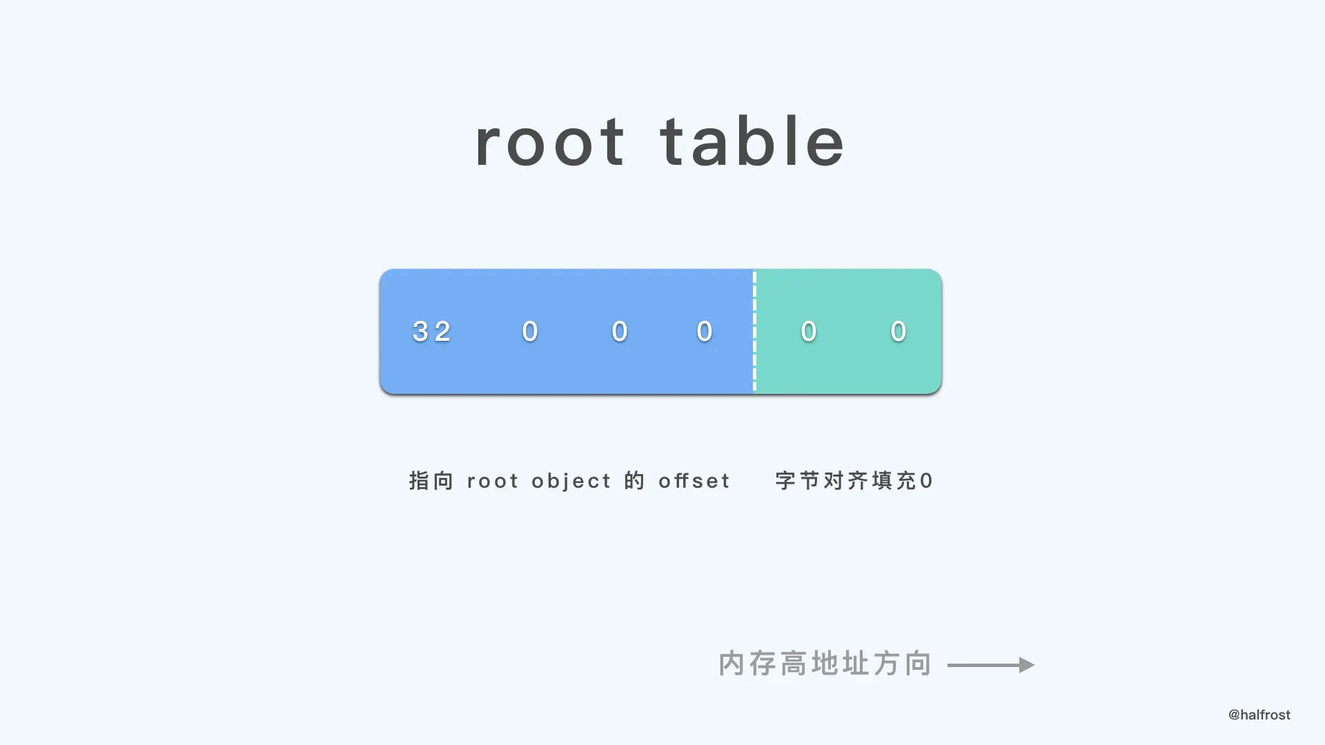 结束序列化的时候,还需要执行两步操作,一是字节对齐,二是存放指向 root object 的 offset。