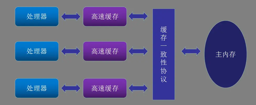 先从计算机的硬件效率说起,CPU的计算速度比内存快几个数量级,为了平衡CPU和内存之间的矛盾,引入的高速缓存,每个CPU都有高速缓存,甚至是多级缓存L1、L2和L3,那么缓存与内存的交互需要缓存一致性协议,这里就不深入讲解。那么最终处理器、高速缓存、主内存的交互关系如下: