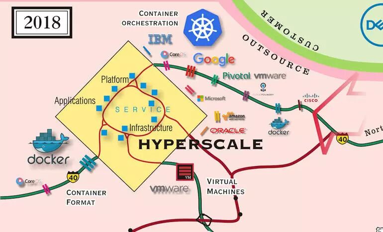 6 月末,在 Cloud Foundry 峰会上,Cloud Foundry 基金会发布了 Kubo,这是一种在传统机器内部 staging Kubernetes 的多个负载均衡实例的工具。这为 8 月份的 VMware 和姊妹公司 Pivotal 与 Google 建立合作关系打下基础,并推出 Pivotal Container Service(PKS)。这个消息发布于 Amazon 与 VMware 建立合作伙伴关系一天后,当时 Kubo 已经为 Google 云平台定制进行了商业实施。值得注意的是,在整个 PKS 首次发布会期间,“Docker” 这个词一次也没被提过。(10 月份,Kubo 项目更名为 Cloud Foundry Container Runtime。)