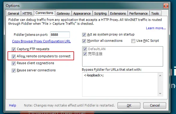 再者要知道fiddler的端口号,Tools->TelerikFiddler Options->Connections,port中值就是端口号,一般默认为8888;接下来开始操作手机;