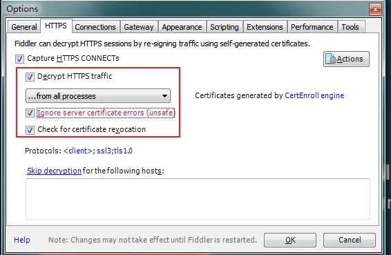 2.配置https抓包 tools--options--HTTPS--勾选Decrypt HTTPS traffic和Ignore servercertificate errors两项,点击OK,弹出框会有证书验证点击确定