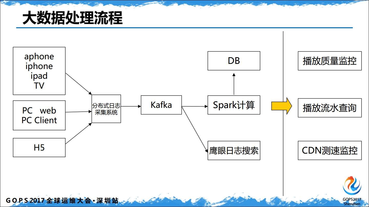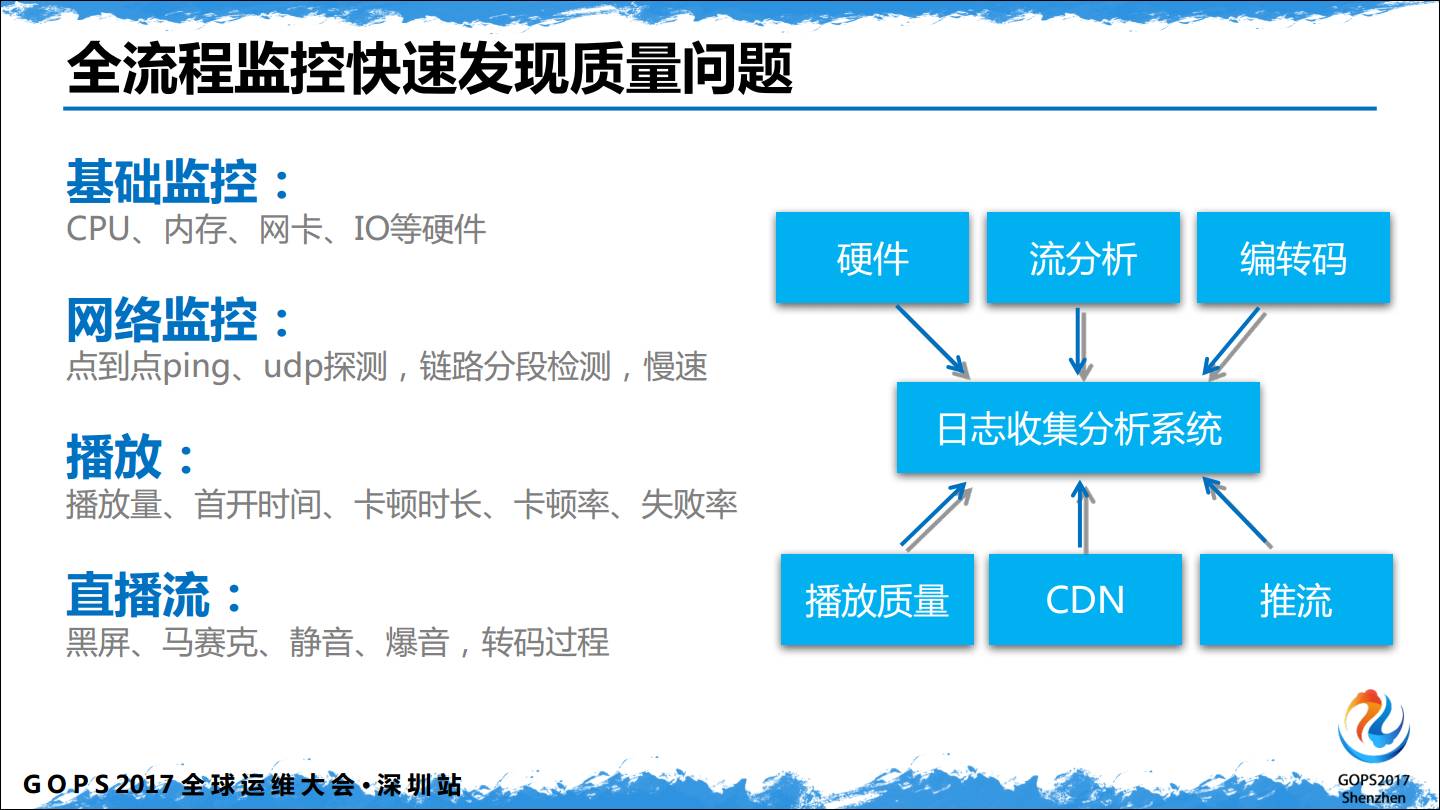 一旦有了监控的数据,能够快速得到的时候,你就真的能够先人一步去发现问题,什么样的问题也能够快速获取。这里的技术其实涵盖很多方面,虽然说起来很简单,但是涵盖了海量运营的技术基础,涵盖流媒体的基础,涵盖大数据技术。
