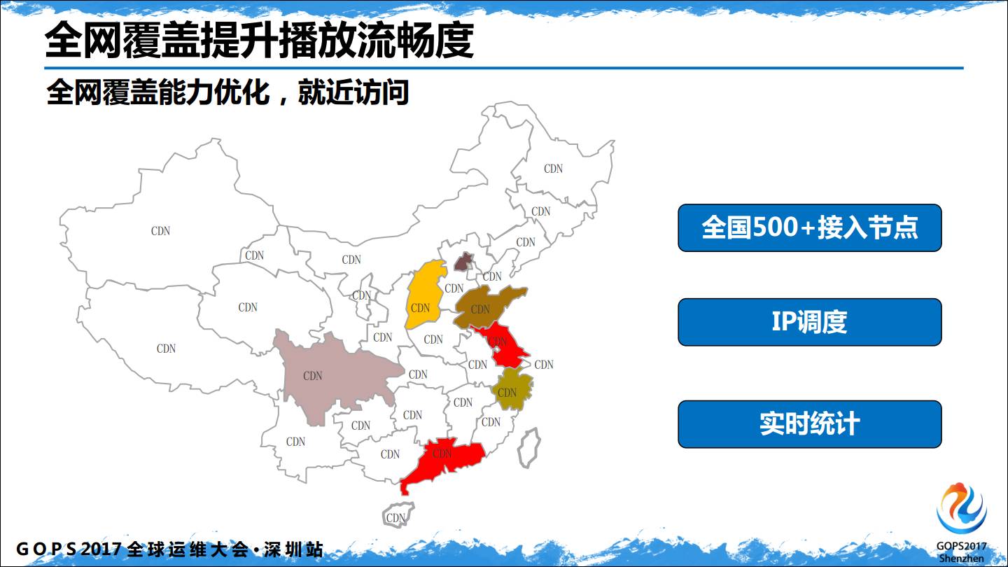首先是最普世的技术,CDN 的技术,我们在全国部署了500个 CDN 的节点,包括新疆、香港这些地区,包括很偏远的云贵地区。