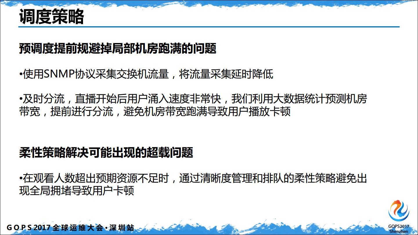 调度策略就是这两种,如果用户在快速进入过程中的话,如果只是局部的,那就是以快制快,通过更快的速度拿到我们现场的机房流量,另外一个方式就是通过柔性方式,当用户来得我们无法承担的时候,不是说用户从A机房挪到B机房能够解决的时候,这时候就要极少解决,排队或者降级策略,比如说音频或者低清晰度画质,来满足部分用户,避免他造成全局用户的影响。