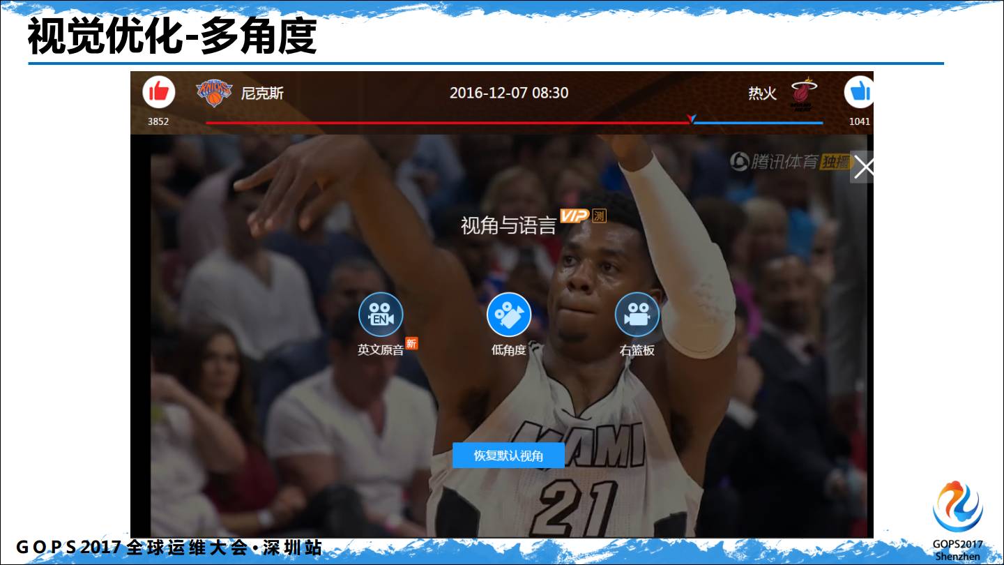 播放另外我们还需要多角度和多清晰度,多角度是满足于各种观看的角度,我们在NBA实现的是有三个视角,比如说蓝筐下面,左视角右视角,让大家从不同的角度去看比赛。