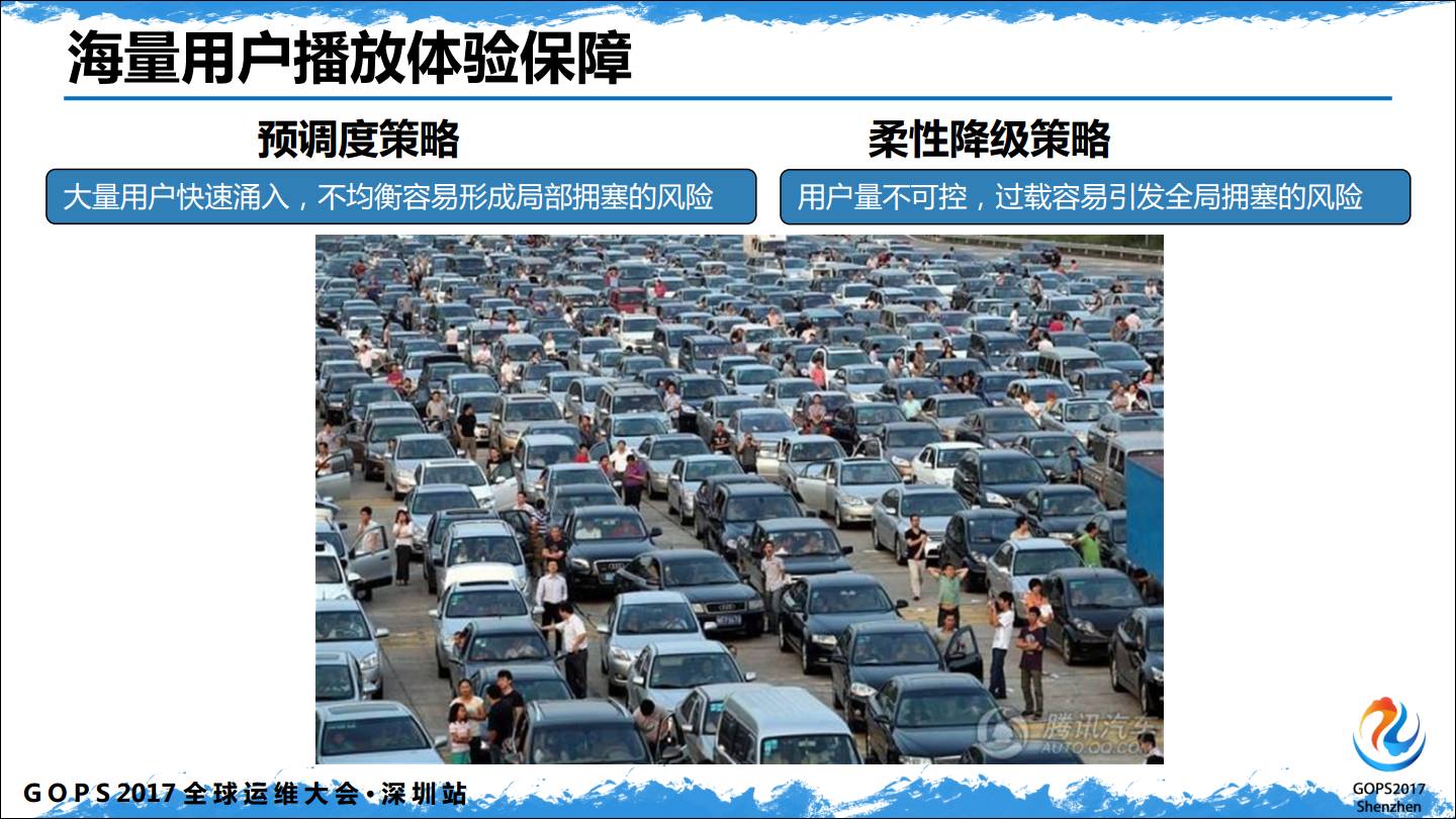 调度策略—柔性策略另外的方式就是柔性解决全局拥塞风险,当然我们有一个非常丰富的用户在线预测体系,也会根据每一场比赛的球队粉丝数还有不可控因素,还有这场比赛推哪些渠道和引流,每个比赛之前都会有专业的数据分析,比如这场比赛可能会有五百万人或者六百万人,但实际上预测是很重要的环节,但不是绝对安全的环节。没办法预测完全准确,就像九三阅兵的时候,大家都预测有多少人会看阅兵,最后让我们大跌眼镜,每个人都在看阅兵,所以预测不是绝对可靠的,只能做一个理论的依据。