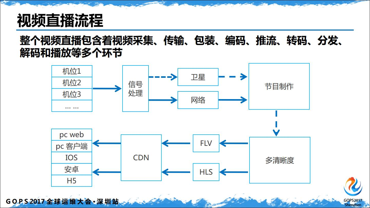 比如整个视频直播包括从视频采集、传输、包装、编码、推流、转码、分发解码和播放等多个环节,不算其他我们总共有十八个环节,再比如说机位1机位2机位3,要做简单的信号处理,上卫星或者是网络传输,网络传输再传到节目制作中心,再进行包装,包装完了以后开始分发给用户。