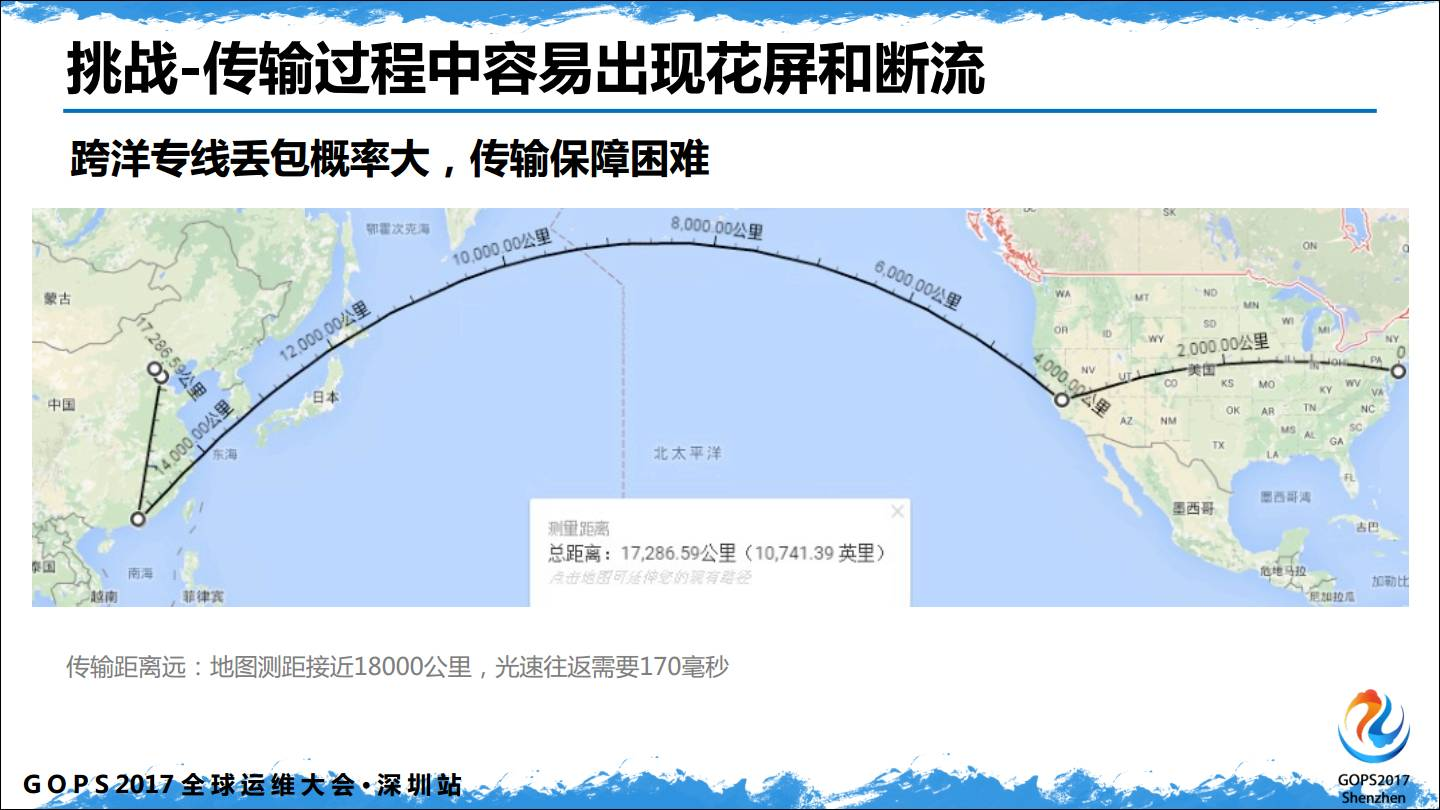 我们当时选择的方式是网络传输,从美国的新泽西机房一直到传过北美大陆,传过太平洋,再从香港的节点到北京,这么大的距离,我们当时测了一下距离,是17286.59公里,这么远的距离,大海有自然因素,可能会有海啸,非常容易导致整个线路的不稳定。