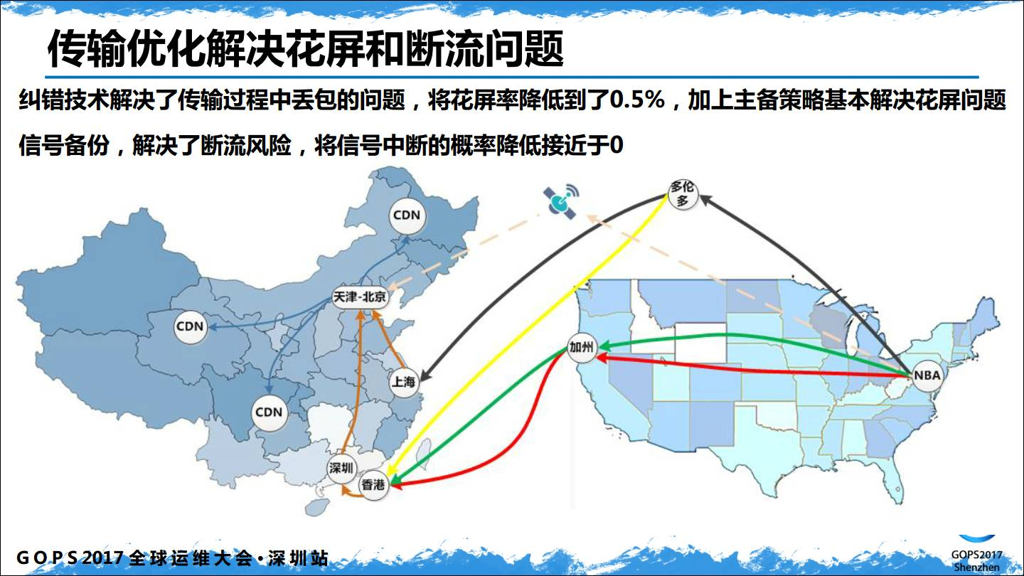 多链路备份刚才说的还有千分之五的概率,怎么解决呢?我们做了网络备份的技术。我们在北美大陆和太平洋专线部署了三条专线,每条专线会有红色或者绿色或者是黄色,还有黑色,颜色只是代表着一些信号传输的区别,因为我们不是每一路信号都进行备份操作或者是有多份的备份,有些只对主信号进行多备份的传输。