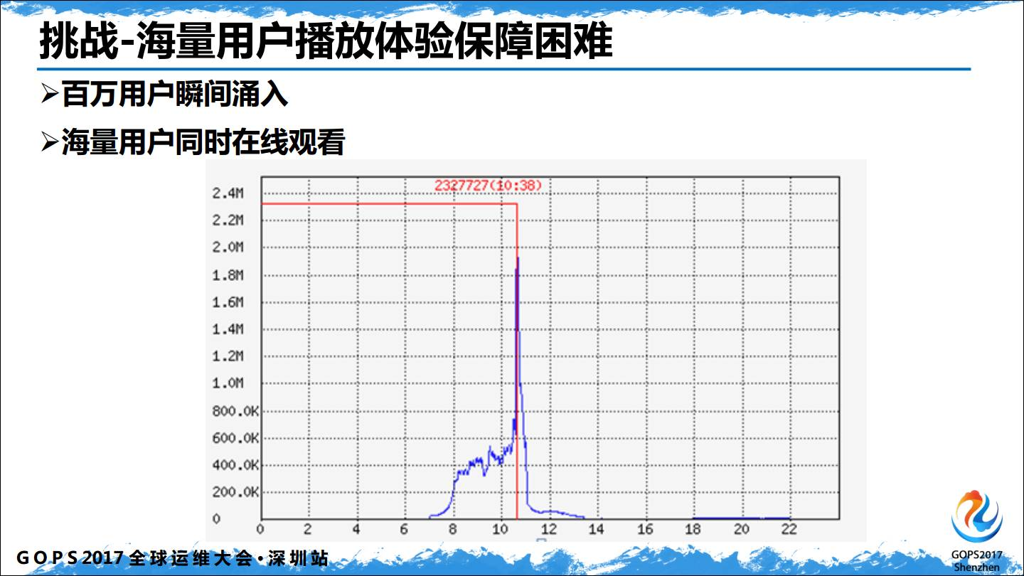 监控最后是监控,环节这么多,距离这么远,活跃用户是接近过亿,这么多的终端和用户,出故障的概率就很大,我们怎么去保证,去把各种风险降到最低,但是风险是不可能不出现的,故障是一定出现的,怎么样让故障出现以后,让预案快速启动,这个监控是非常重要的环节。