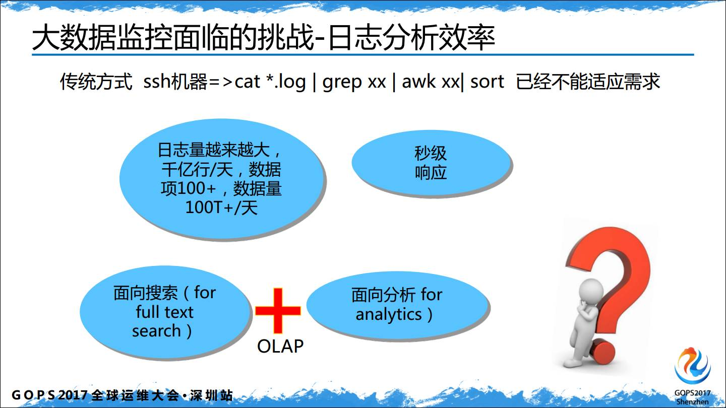 传统的方式已经不再适应需求,现在面临的是每天千亿的数据,每条可能有一百个维度,数据量每天超过100,我们还需要有一个秒级的响应,要求打开的速度是10秒钟响应,延迟是30秒。这时候我们就要引入新的技术,面向分析,面向搜索的技术,去推进我们在监控领域面临的数据量的挑战。