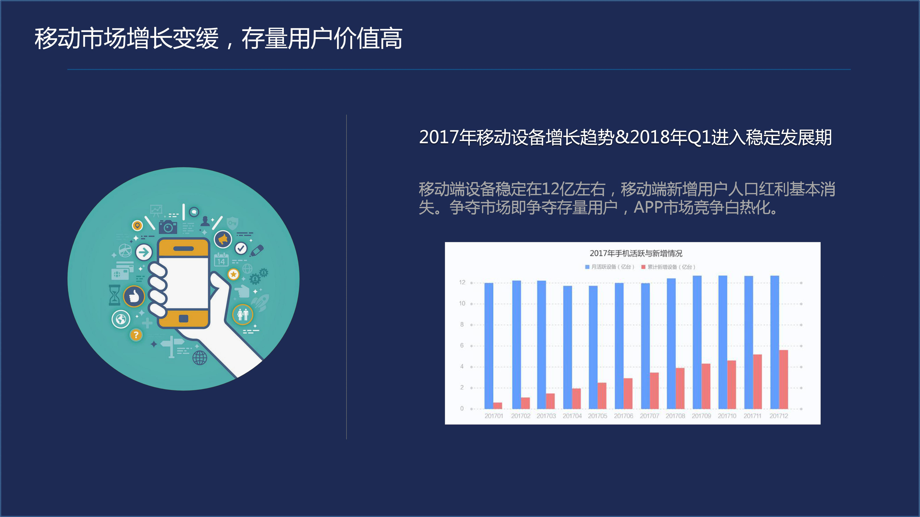 中国的网友有8亿之多,98%的用户群使用移动互联网。2017年始,月活的移动设备数量稳定在12亿左右,新增红利在渐渐消失。深挖存量的大盘用户价值,有两方面的考虑:一方面,我们希望给整个大盘的存量用户提供更有针对性的个性化服务、产品和推荐;同时针对各个行业,挖掘出大盘用户的价值,为行业带来数据上的增长。