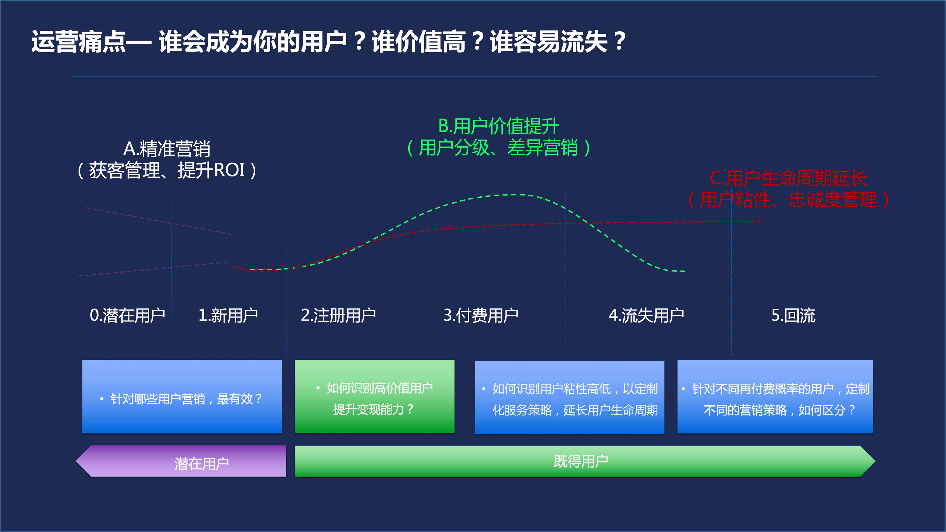 用户行为预测帮大家解决的问题有哪些?从运营的角度考虑,获取潜在客户的环节,可以帮大家了解谁是你的用户,哪个平台适合做精准化营销。获取用户之后,我们会分析哪个用户价值比较高,更容易付费转化。我们可以做这样的识别,哪些用户在一定的生命周期后会流失,我们要做出流失预警以提前干预,而不是等到流失后再干预,这时候已经来不及了。