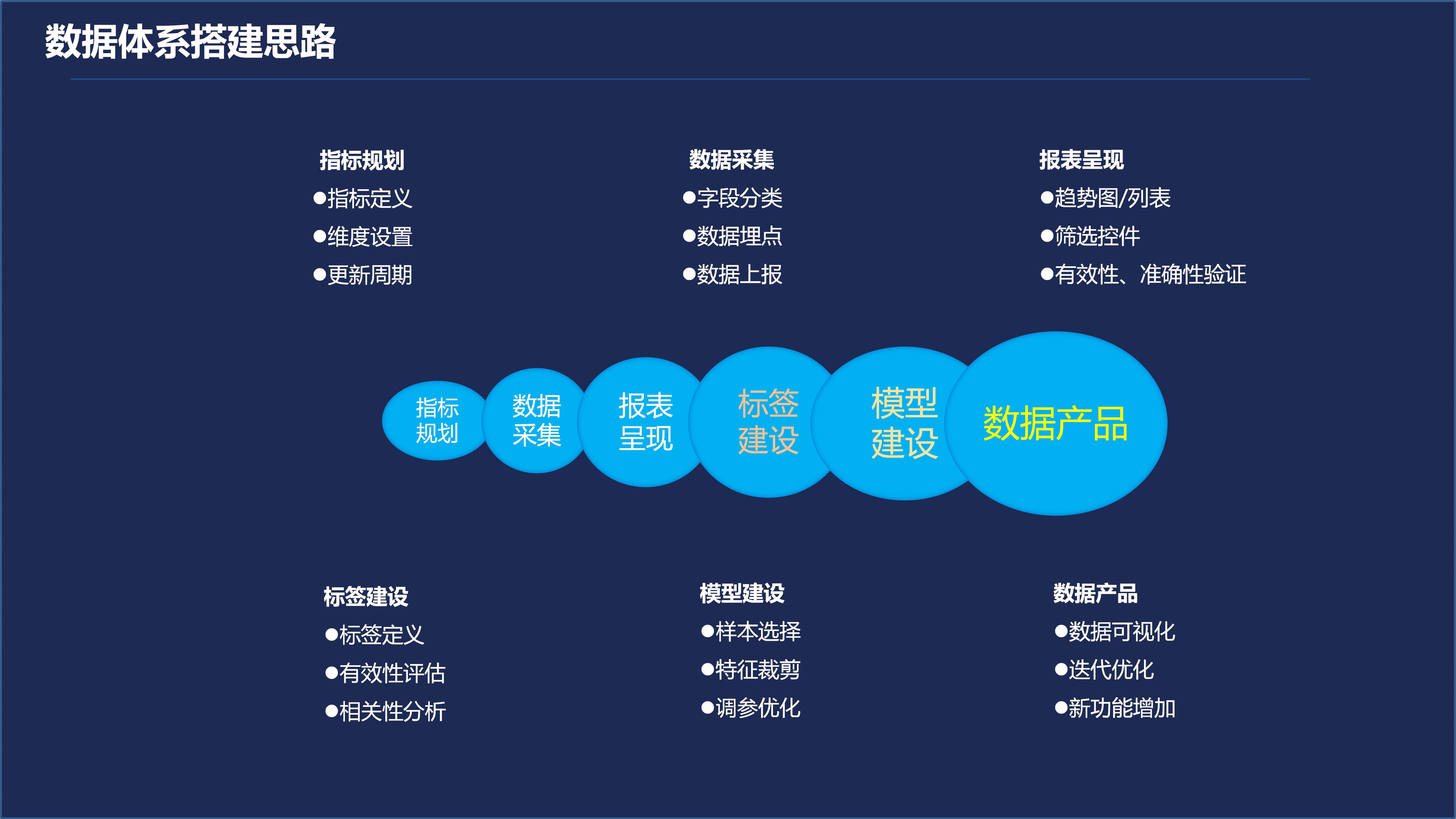 现在市场上的移动分析,也需要相应的工具。例如上面提到的三个方向,我们要做数据化的运营,首先要明白运营指标、目的是什么,从而把这个指标转换成数据的指标。比如每天的转化率,我们会推动终端做数据的采集、APP的打点,将数据分析和数据开发通过相应的报表进行呈现。整个过程中,不管是我们自研还是用外界的工具,比如云盟和腾讯分析等,我们都可以直观地看到一个产品运营的情况。但是要做深入挖掘,判断哪一个用户有价值,这肯定是不够的。我们还要进行标签的建设、模型的建设,判断应该构建哪些标签、哪些模型。最终构建的标签和模型都需要落地去做数据产品,做到可视化,使我们的运营、产品所见即所得,找到一个比较好的运营方向。