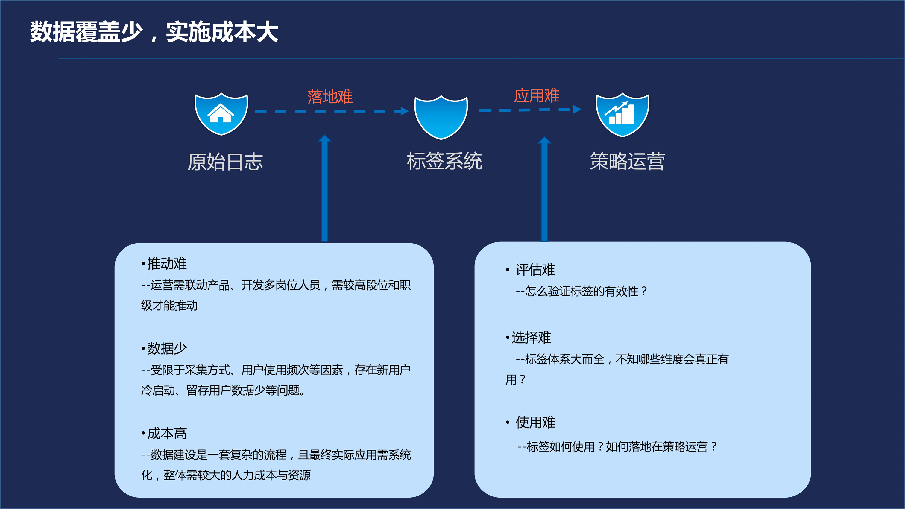 在整个实施过程中,我们也了解到,无论是教育行业、金融行业或其他电商行业都面临同样的问题。数据在终端收集之后,我们要落地到标签系统,生成标签。这个环节会非常困难,首先我们要联动很多岗位的同学,从产品到终端开发、后端开发,以及数据分析、算法等等。大家的KPI是不一致的,运营同学主要是做数据增长,后台、终端同学更多倾向于做出新功能和并维护旧功能的稳定性。这样的数据需求提给他们,你说要打一个点,很有可能很小的事情会做到一个月甚至是半年以后。这里存在一个应用难的问题。