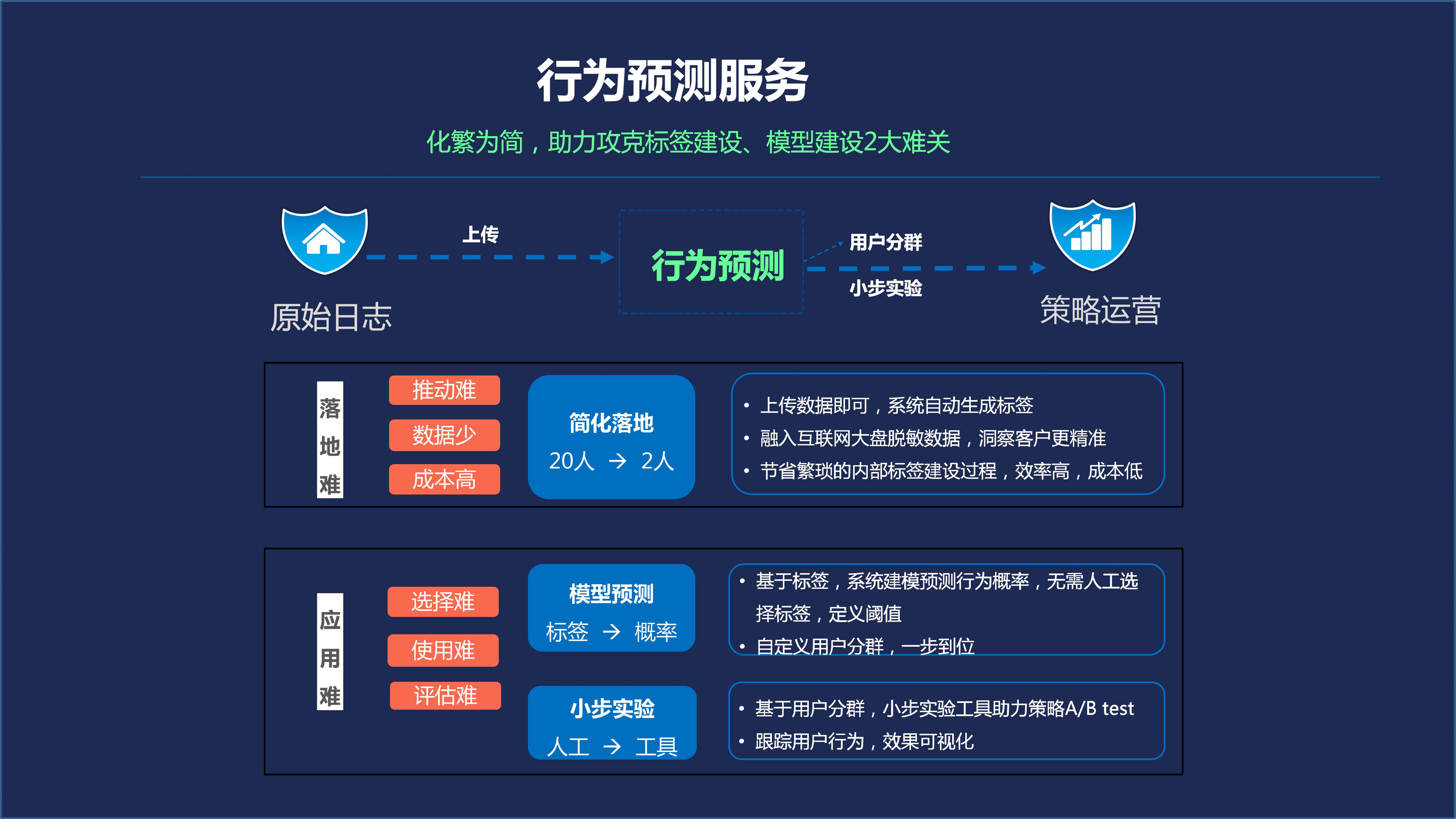 用户行为预测项目的出发点在于标签建设和模型建设这两部分。化繁为简地说,我们希望做到的是我们来提供API,大家来上传行为数据,我们再进行落地的简化。大家不需要做标签建设和模型建设,我们可以直接预测用户的付费评分、转化评分,以及一周内是否会流失的预警。在简化落地这部分,如果大家联动开发、算法、分析一起做这个数据产品,需要20个人甚至更多。但在使用这个产品之后,只需要两个人去做这件事。一个人开发API,接入数据;另外一个人使用这个系统做运营。同时,我们也提供小步实验的工具。