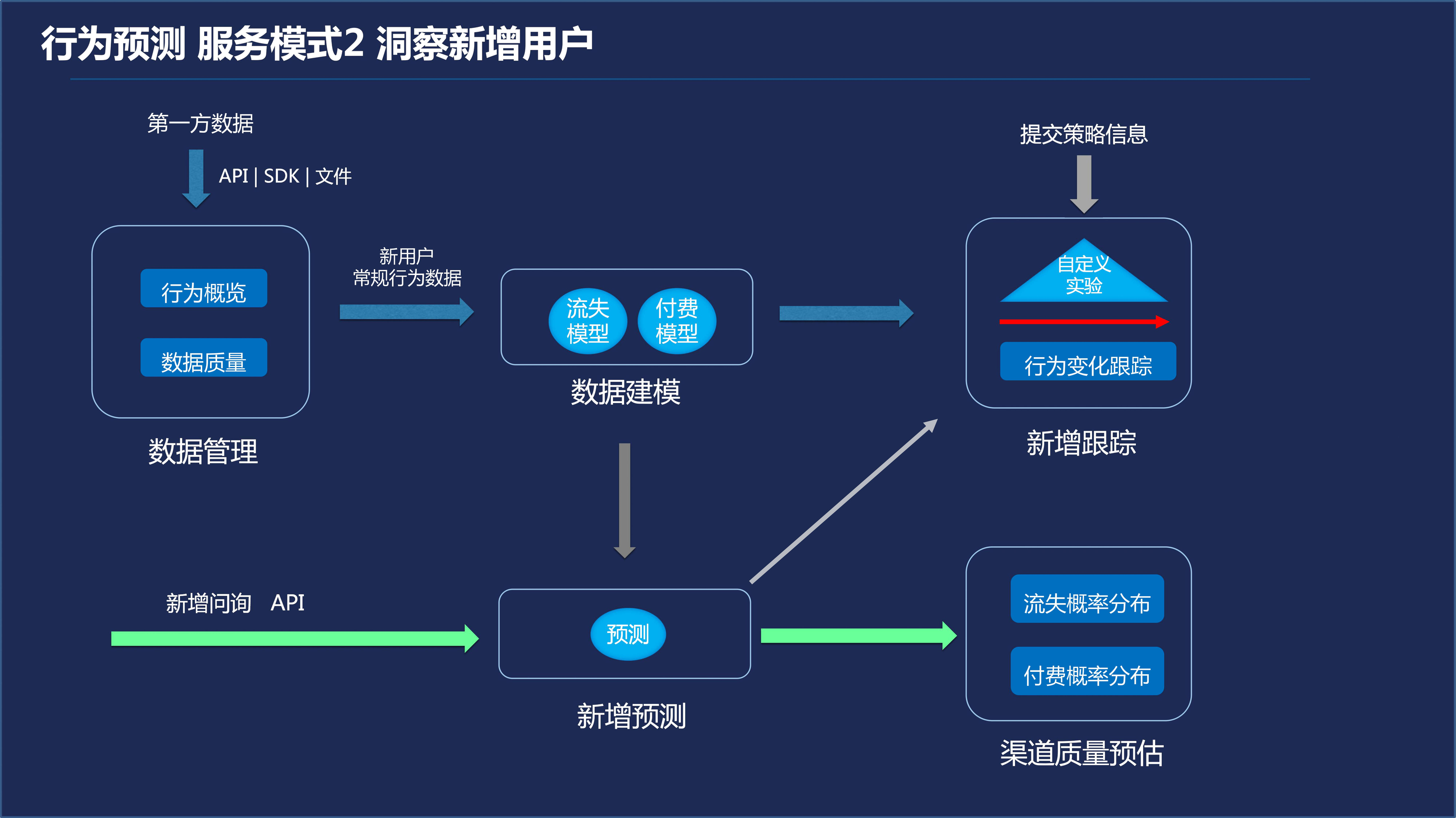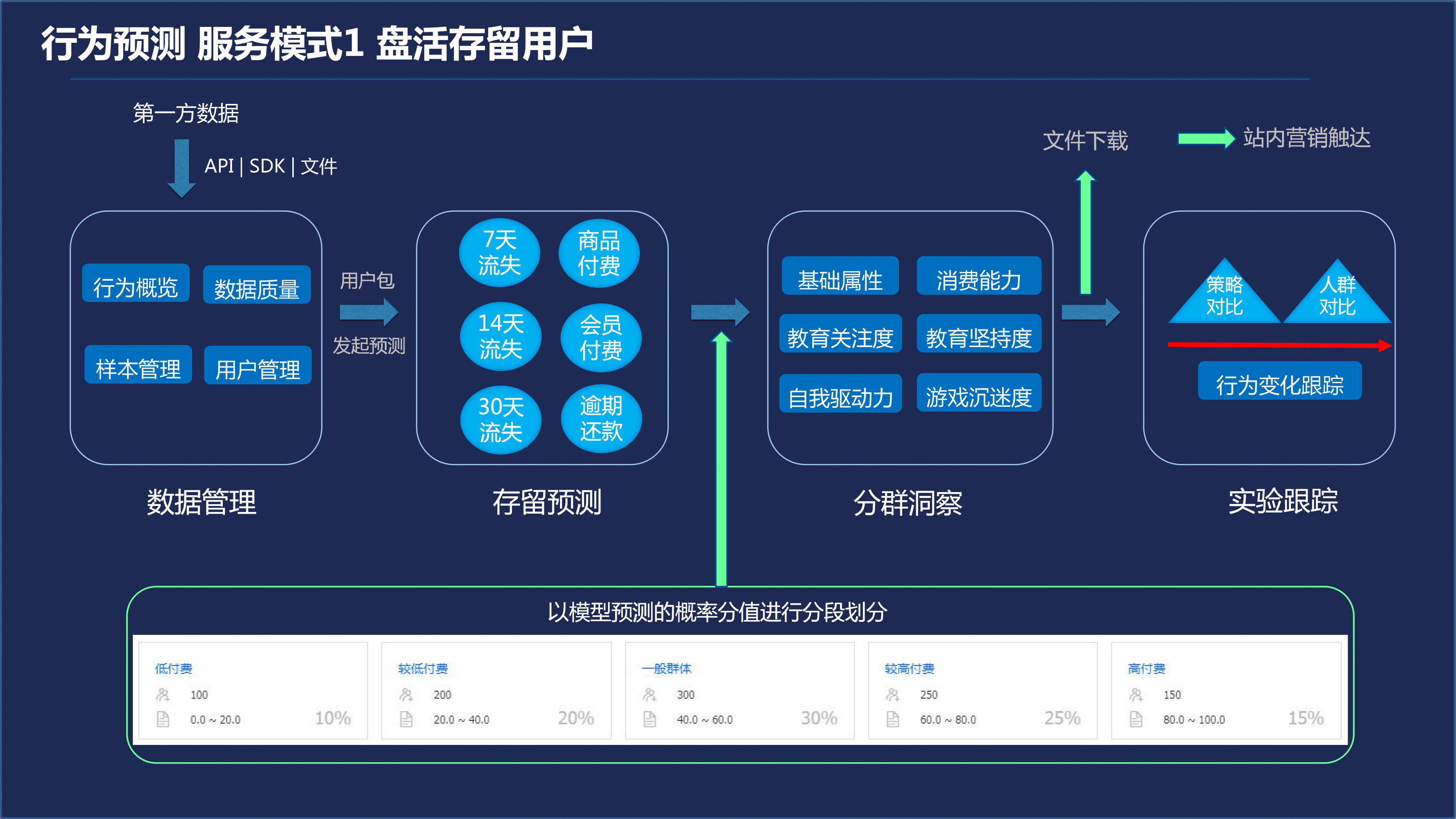 刚刚提到三个方面的服务,第一方面是对留存用户,第二方面是对新增用户,第三方面是帮助大家挖掘潜在用户。先来看一下留存用户,也就是现在已有的用户,这种场景比较好的地方就是第一方数据相对较多,我们的模型会比新增用户的模型更好。主要分为以下四个部分,一是数据管理,数据管理不仅是第一方数据,也包括互联网大盘的脱敏数据,我们会有针对性地进行融合。第一方的数据是注册信息、设备信息、行为信息,比如用户登录的时间、浏览的页面。这些信息接入进来后,我们会进行概览性的分析,比如每天的PV、UV分别是多少。同时我们也会对每一条数据进行质量评估,因为每一个字段的完善度都会影响模型的效果,如果完善的话,模型将在0.8以上;如果不完善则会在0.7到0.8;如果特别差的话,模型就不能被使用。