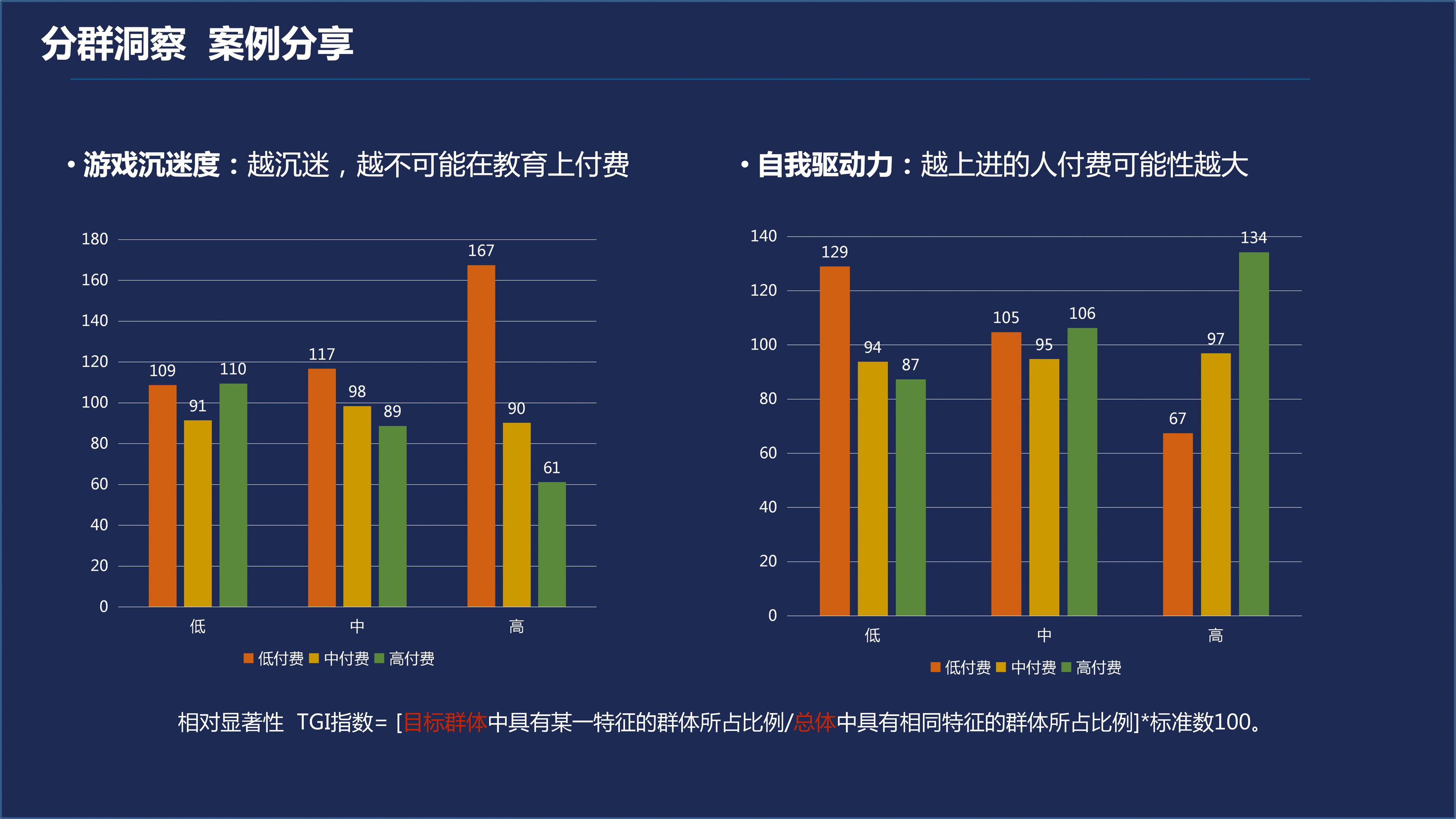 再来介绍一下我们分群所用的标签。我展示出来的是两个画像,一个是教育关注度,一个是教育坚持度。首先介绍一下图表,图表上207这个数字,表示的是TGI的相对显著性,数字越高表示这个特征和它所对应的分子越大,也就是正相关性越高。这个数字大于100表示正相关,小于100就是负相关,数字越小就表示负相关越大。教育关注度越高的这些人付费意愿就会更强。教育关注度就是根据客户在大盘教育类的咨询,以及周边产品的关注程度聚合出来的画像。