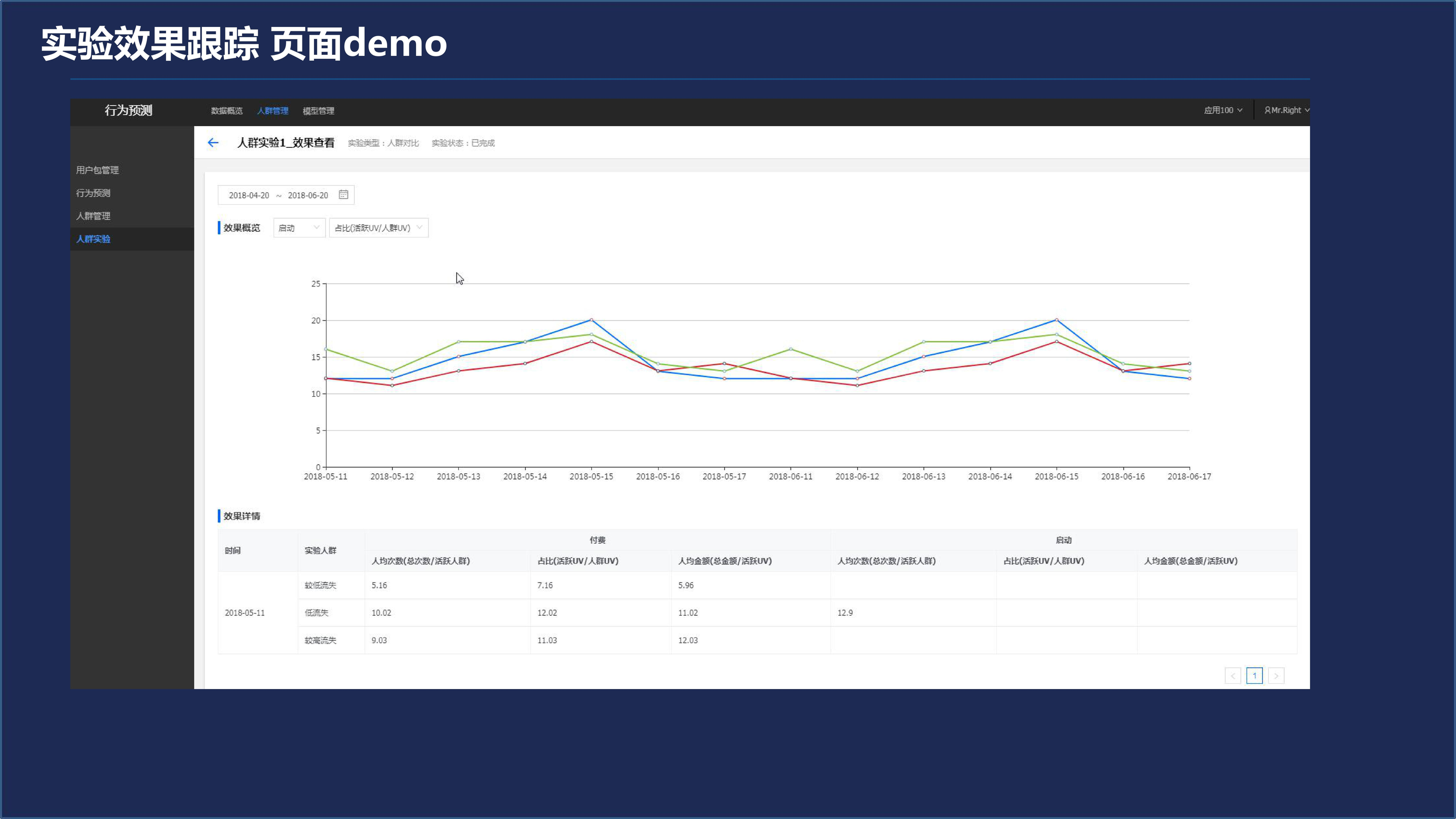 这是一个实验项目的跟踪展示,上面是测试数据,不是真实的数据。我们的实验包括两种实验,一是人群对比,将较高付费的人群及高付费人群做同一个策略实验。我们可以打电话营销、发短信营销,甚至可以建群为他们进行针对性的服务。在这些方式下,可以得出哪种人群转化率更高,哪种策略更适合哪个人群。第二是策略对比,针对较高付费的群体,我们进行刚刚三个策略实验,就可以看出哪个策略对这部分人的效果更好,在具体的运营实验上花更少的成本,去体验整个实验的效果。