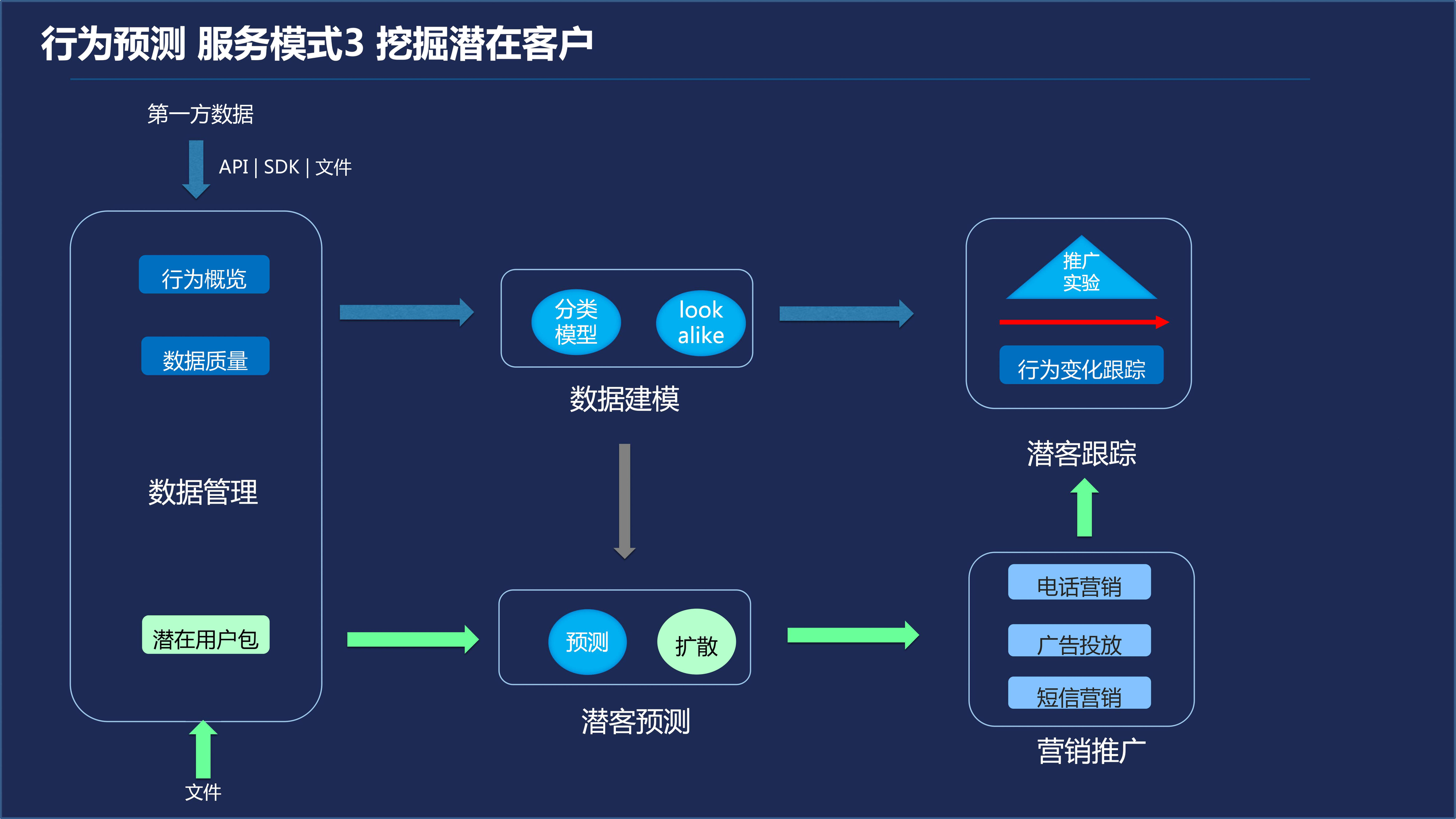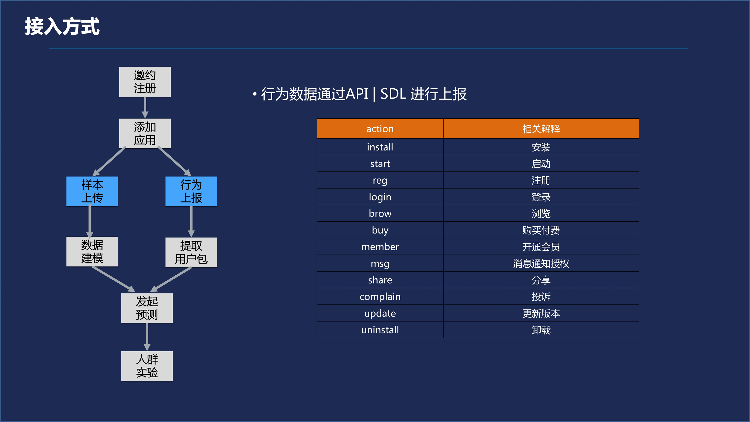 我们的接入方式比较简单,但也会存在一定的开发量。首先客户将行为的数据通过API提供给我们,这里的样本有两种方式。如果行为数据比较全,我们可以直接进行操作。如果行为数据不太全,或不太符合预期,我们会让客户提供一个样本。数据建模由我们进行支持和处理,客户可以在产品系统上提取用户包进行预测、实验和效果的跟踪。