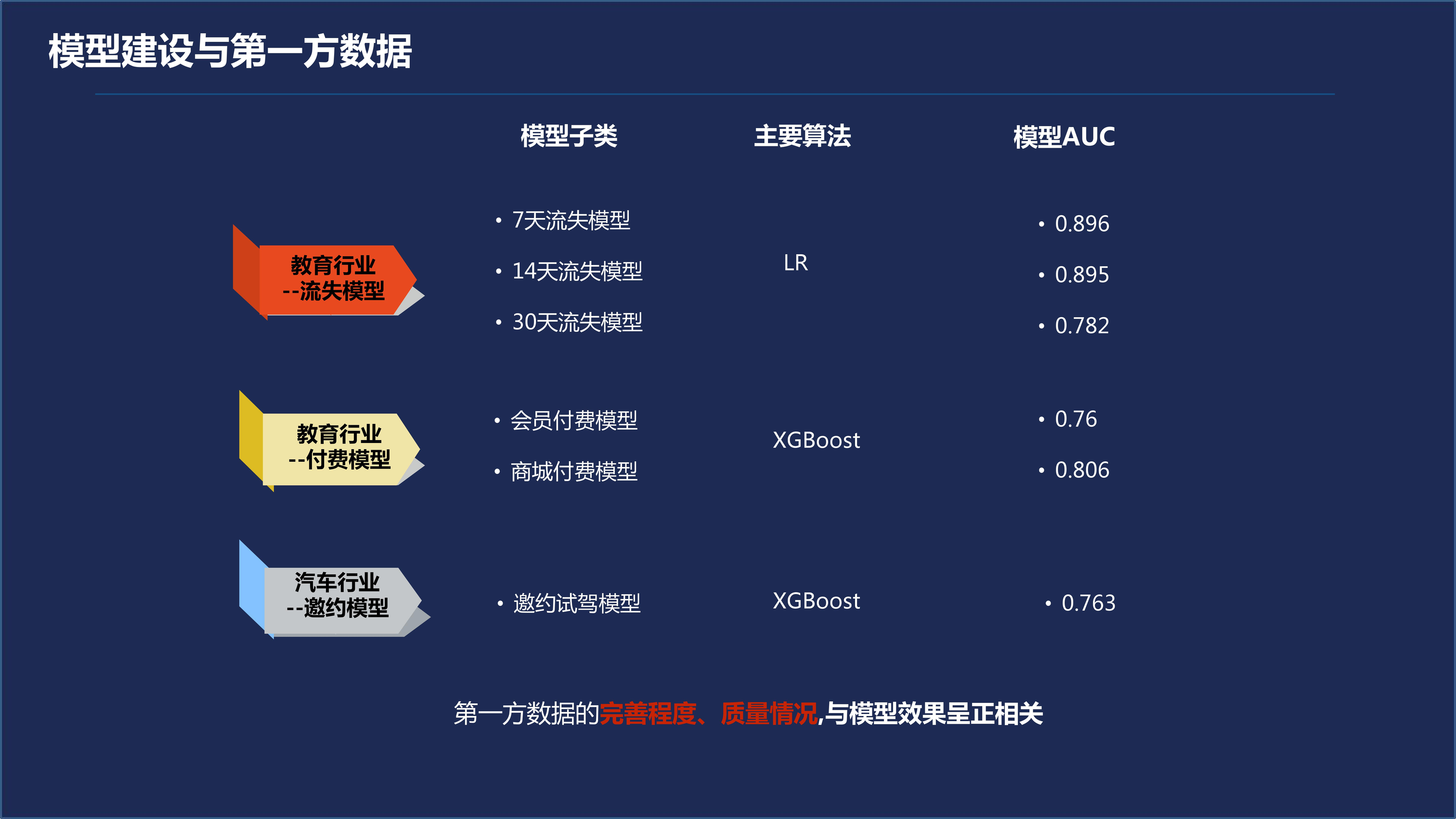 第一方的数据完善程度和模型效果有相关性。如果第一方数据比较完善,可以达到0.8到0.9的AUC,它的识别能力非常少。如果数据不太完善,只有50%或者60%的完善程度,AUC会在0.7到0.8之间。如果数据在百分之二三十,甚至没有第一方数据,那么AUC就在0.7左右。
