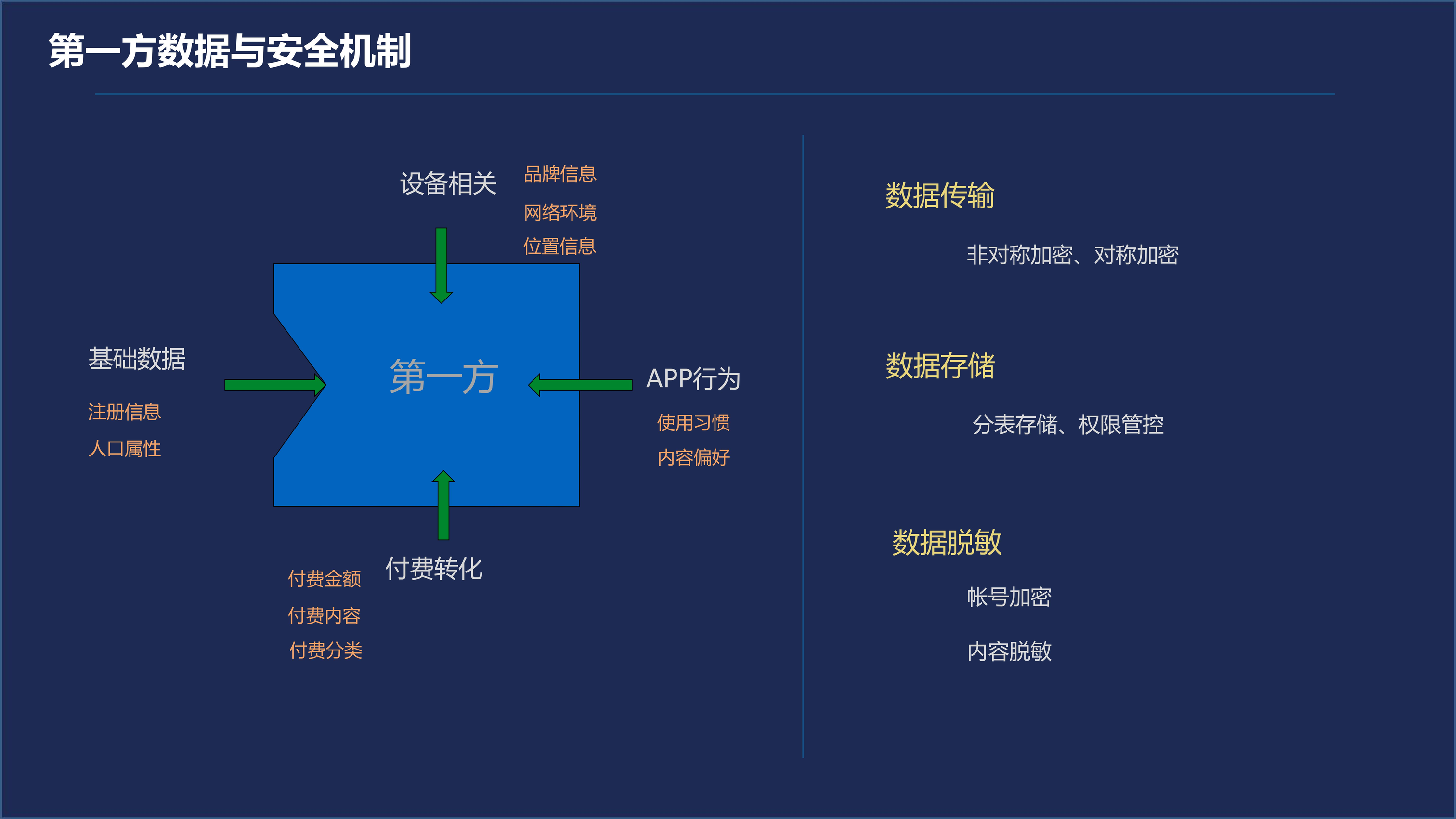在第一方数据和安全机制部分,第一方数据,就是某一方面的数据,它对某一方面的模型有直接的影响。在做付费模型的时候,基础数据APP行为、付费转化有着直接相关性;在做流失模型的时候,基础数据和设备相关的信息、APP行为的信息有直接相关性。第一方数据是客户提供给我们的,无论是金融、电商还是教育,大家都会面临同一个问题,提供数据会不会存在隐患,我们会不会再将这些数据提供给别人。在安全方面我们分为三个等级,一是数据传输上进行加密的支持,即使传输的链接请求被劫持了,其他人也不知道这个数据到底是什么数据,他只能看到一个密文。二是数据存储。在存储用户数据的时候,按照分表物理存储,其中不会有融合的问题,也不会将这些数据给另外一个产品使用。三是数据的脱敏。我们针对账号支持加密,在内容上可以简单地理解为,假如用户A看了张老师的数学教程,在这个看的过程中,我们会将张老师的信息由客户自己定义一个唯一的编号,将这个数学课程也定义成唯一的编号。在这些数据上传之后,我们拿到的只是编号,而不是张老师、数学这样的具体信息。取得这个数据后就可以进行模型上的建设,这里我们会将具体的用户隐私数据过滤掉。