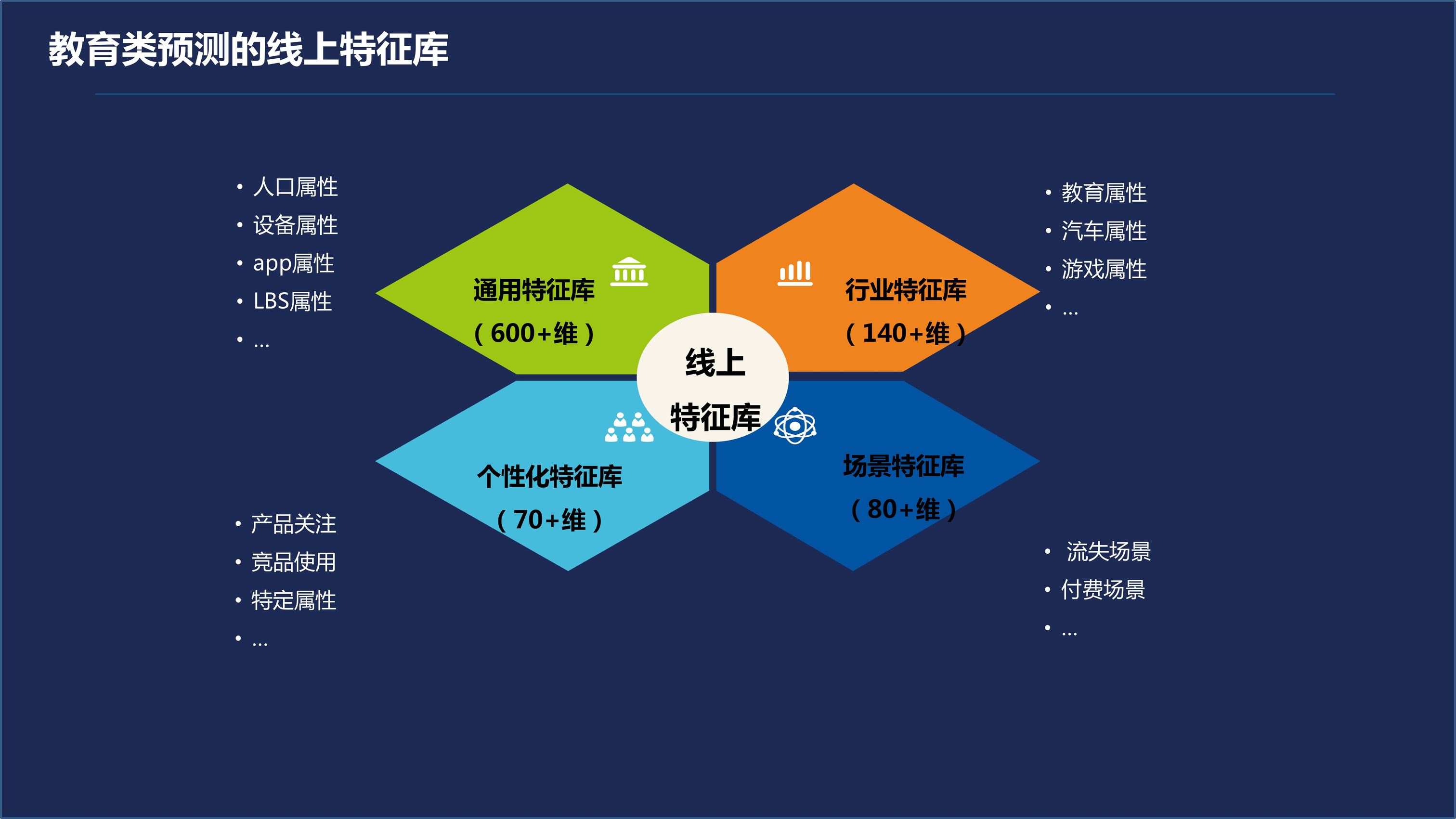 下图是教育类预测线上特征库,我们将其分为四类。每类从上往下是通用、行业、个性化、产品化这四类特征。整个大盘的特征维度有几千维,教育行业我们用到了800多维。