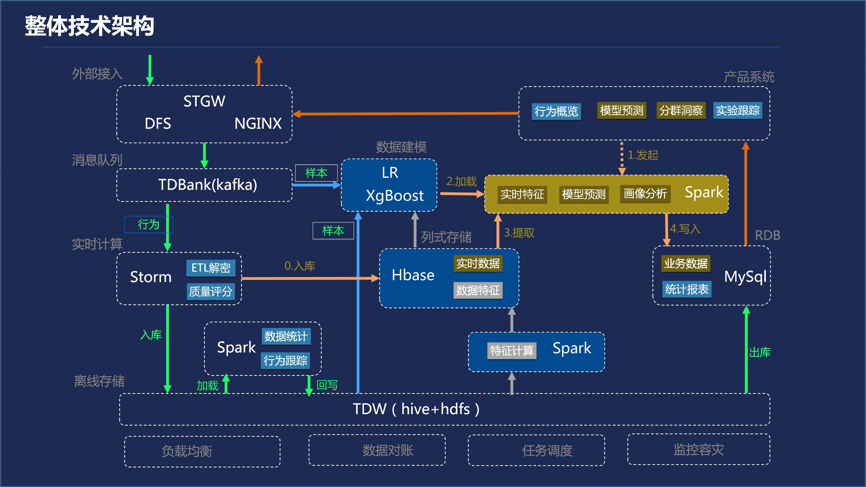 这是一个整体技术架构介绍。因为这是一个数据产品,不像我们常规理解的一个显然的系统,它是各个环节进行协作,最后进行数据产品的输出。首先我们在做外部数据接入时,通过腾讯统一的网关STGW将数据放进来,之后通过DFS数据通道存放到消息队列中。行为数据基于第一方数据的安全,进行了相应的加密和脱敏,我们要进行解密并对每一条数据进行质量的评分。这里有一些质量评分的报警,如果数据可以达到80分,现在一下子变成了60分,我们就需要和客户沟通,是不是某个环节出了问题,因为它最终会导致模型效果较差,使用的体验也会比较差。后面我们会将接入进来的数据存放在TDW,各家的数据进行分表存储,没有融合在一起。之后再将数据取出来进行计算,进行数据行为概览相应的指标分析以及行为跟踪。某一个用户包的行为变化跟踪,就是在这里面进行的。
