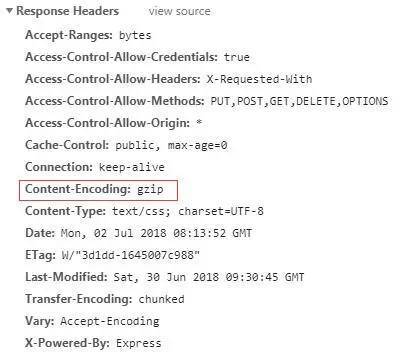 重启服务,观察网络面板里面的response header,如果看到如下红圈里的字段则表明gzip开启成功