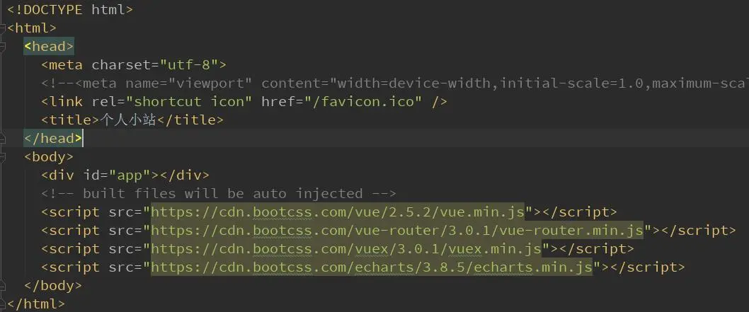 一个原则是尽量将比较大的第三方库放到cdn上去以减少请求时间,在我的项目中,我将vue,vuex,vue-router,echarts都放到了cdn上,具体操作是打开BootCDN 然后搜索关键字并copy链接粘贴到index.html的body闭合标签前,如下图