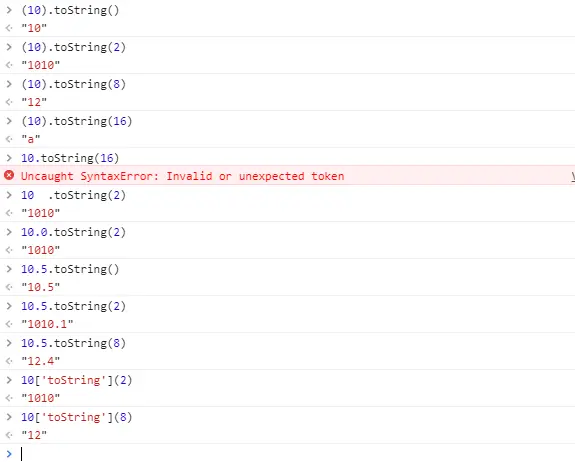 只要能够让 JavaScript 引擎不混淆小数点和对象的点运算符,各种写法都能用。除了为10加上括号,还可以在10后面加两个点,JavaScript 会把第一个点理解成小数点(即10.0),把第二个点理解成调用对象属性,从而得到正确结果。