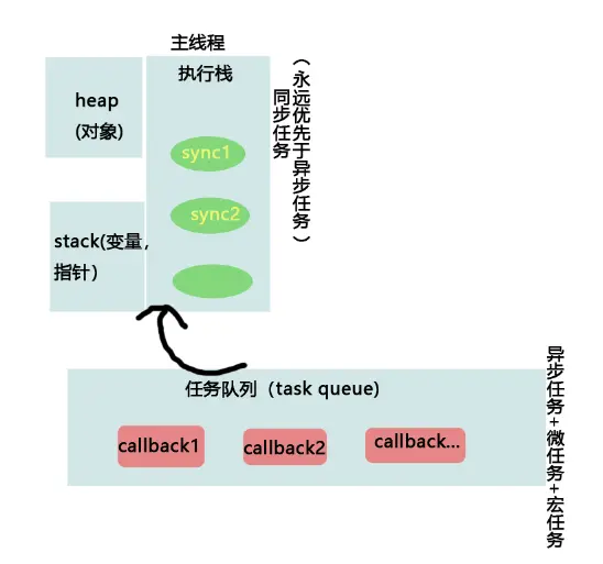 2. 主线程中的任务是同步任务,同步任务位于执行栈中,按照顺序执行,执行栈清空后才去任务队列读取任务。