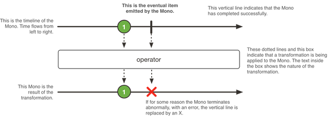 下面的图片是 Mono 的处理流程,可以很直观的看出来 Mono 和 Flux 的区别: