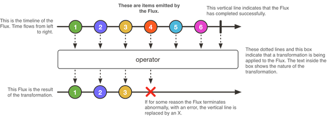 关于 Flux 的工作模式,可以看出 Flux 可以 触发 (emit) 很多 item,而这些 item 可以经过若干 Operators 然后才被 subscribe,下面是使用 Flux 的一个例子: